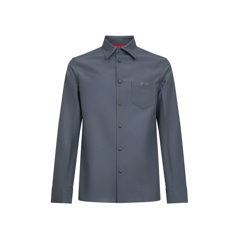 Front button placket Pointed collar Long sleeves, buttoned cuffs Chest patch pocket with metal Horsebit detail Straight hem Fabric-covered buttons Total length: 72 cm (size IT 46) Slim fit Grey color 100% Polyester Made in Italy
