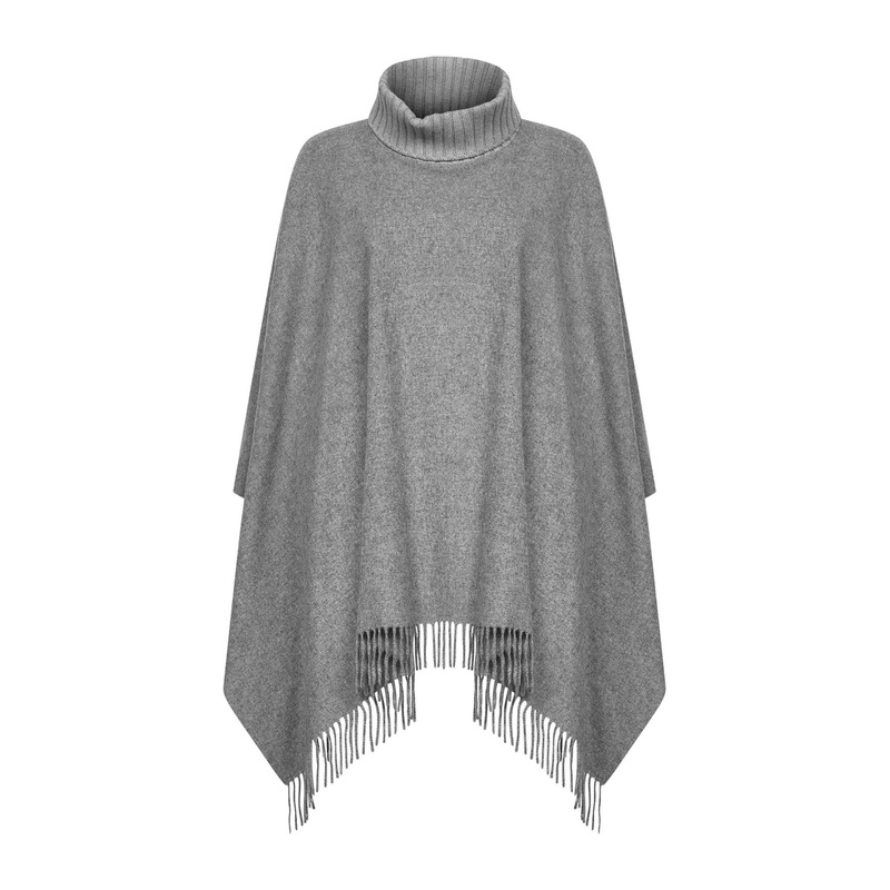 Ribbed knit turtleneck collar Fringes at hems Asymmetric hemline Grey color 90% Wool, 10% Cashmere Made in Italy
