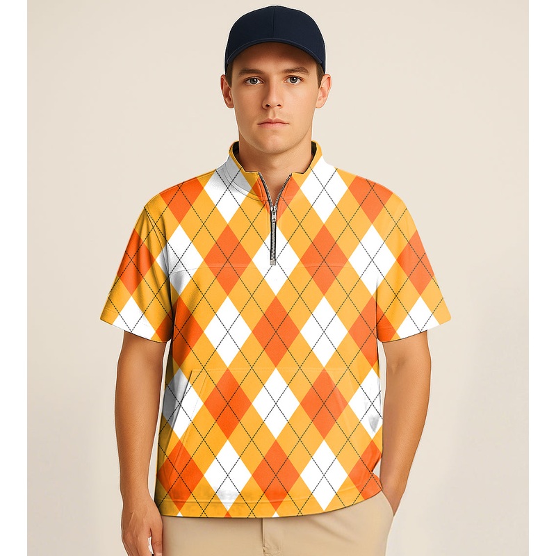 Half Zipper Turtleneck Golf Short Shirt Halloween Cross Orange White Argyle Embroidery