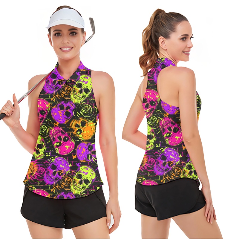 Halloween Colors Skull Womens Sleeveless Golf Tank Top Shirt Polo
