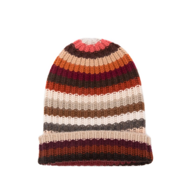 This stylish Hat Hurray is the perfect accessory to elevate your winter wardrobe. Crafted from 100% cashmere, it features a luxurious ribbed knit design that provides both warmth and comfort.The hat showcases a beautiful combination of brown, beige, orange