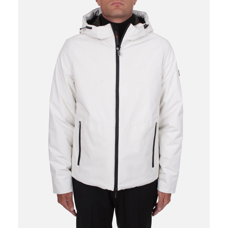 Double slider zip closure, two side pockets with zip closure and the brand logo patch on the left sleeve. Slim fit