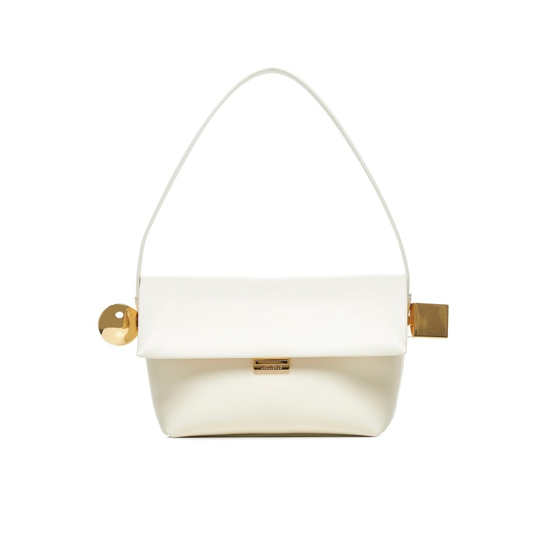 Il Rond Carr is a refined nappa leather clutch that marries minimalist geometry with articulate detailing. Crafted in soft ivory lambskin, the fold-over flap closes with a magnetic fastener while a top handle offers handheld elegance. Gold-plated hardware, including a sphere-and-cube charm and a subtle logo plate, lends a luminous signature to the silhouette. Practical features include a rear patch pocket and internal patch and zip pockets to keep essentials organized.