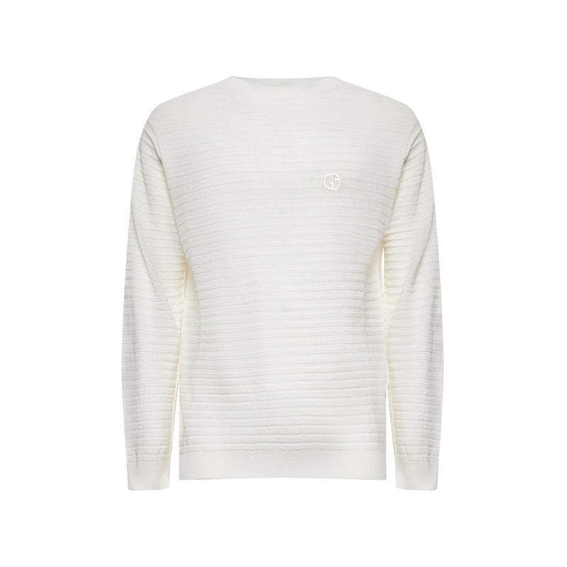 Ribbed crewneckLong sleevesTonal GA logo embroidered at chestRibbed cuffs and bottom bandPlain and purl knit; 15 gaugeRegular fitIvory color67% Linen, 22% Polyamide, 12% Cotton, 2% ElastaneMade in Italy