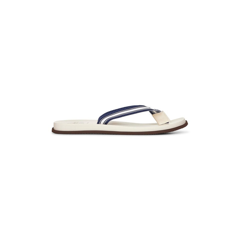 Slip-onThong strap with blue and white striped patternLeather insole with Solomeo crestTPU rubber soleIvory color100% Calf LeatherMade in Italy