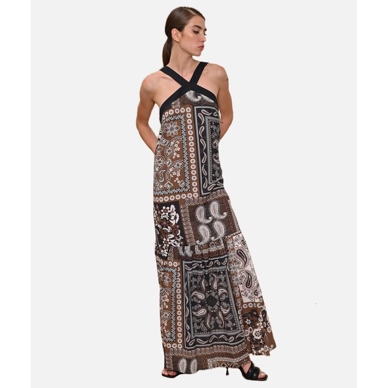 Long printed muslin dress, bandana pattern. Off the shoulder, with contrasting plain wide straps and flounce at the bottom.