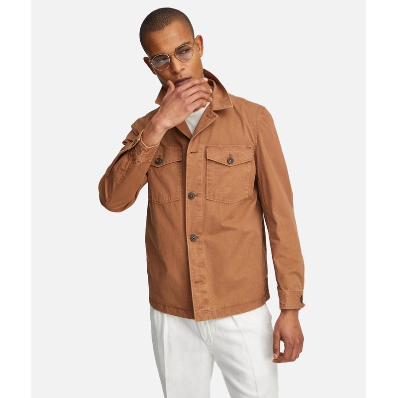 Dynamism, versatility and unmistakable style characterize this overshirt in compact gabardine, with a refined camel shade. Model with two pockets on the chest and two on the sides.