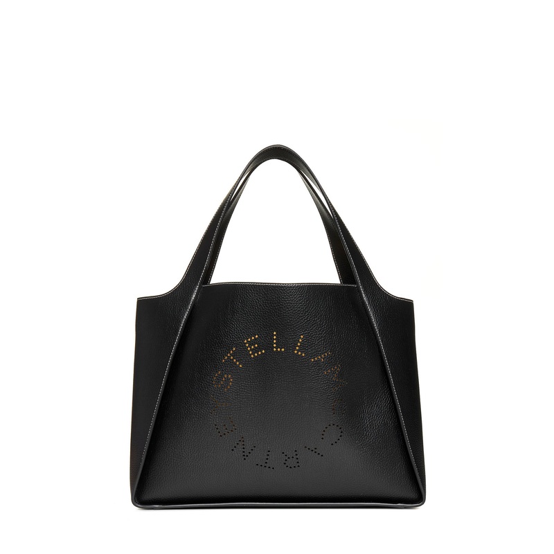 Large Stella McCartney tote bag in vegan leather Mud color with distressed effect Featuring a circular logo lettering detail with eyelets on the front Single main compartment Two top handles Removable internal pouch Made in Italy