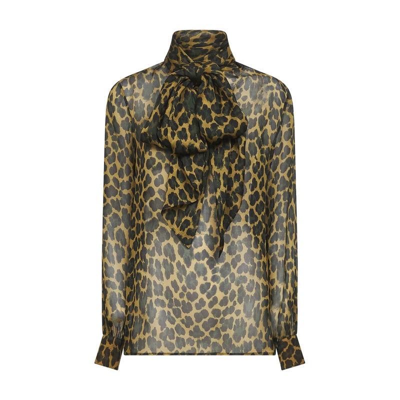 Fabric-covered button closure at neck back; keyhole cut-out Stand collar with adjustable lavallire tie Long sleeves, one-button mitered cuffs Straight hem Semi-sheer certified silk design Color: ochre/green 100% Silk Made in Italy