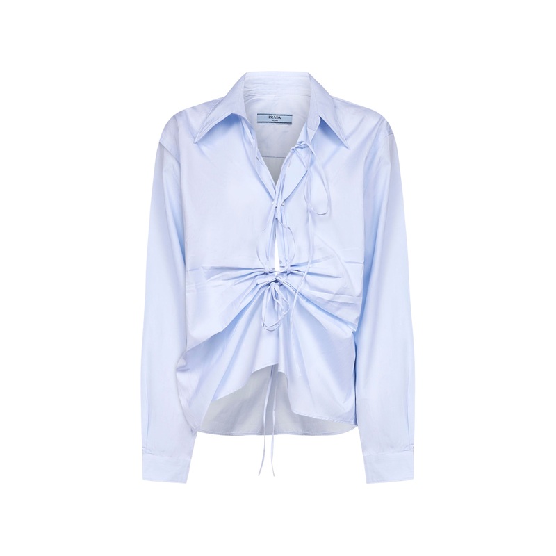 Front self-ties closure Shirt collar Long sleeves, soft shoulders, buttoned cuffs Fabric triangle logo at nape Draped and pleated detailing at front Asymmetric hemline Shapeable collar and hem design Menswear fit Light blue color 100% Cotton Made in Italy