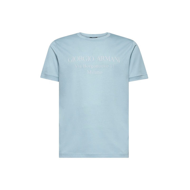 Ribbed crewneckShort sleevesContrasting water-printed Giorgio Armani Borgonuovo 11 Milano logo at frontPima cotton jersey designRegular fitLight blue color100% CottonMade in Italy