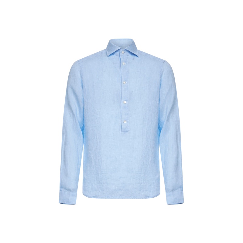 Partial front button placket Polo collar Long sleeves, buttoned cuffs Straight back yoke Regular fit Light blue color 100% Linen Made in Italy