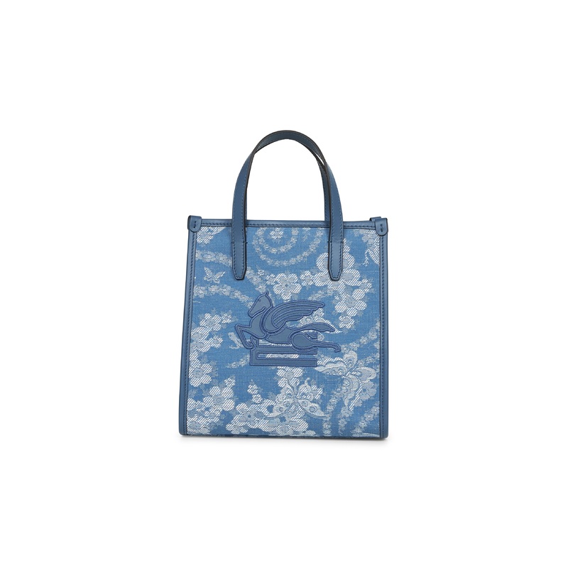 Open top Double leather top handle; adjustable and detachable leather shoulder strap Etro and Pegaso monogram leather patch at front Interior: one main compartment, one zip pocket; striped fabric lining Tone-on-tone calf leather details Cotton blend floral