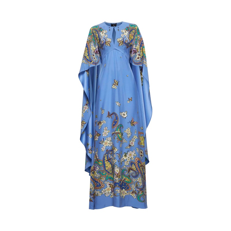 Back concealed zip closureCrewneck with button closure and keyhole cut-outIntegrated cape with asymmetric hemlineMulticolor placed floral Paisley motifRegular fitLight blue color100% SilkMade in Italy