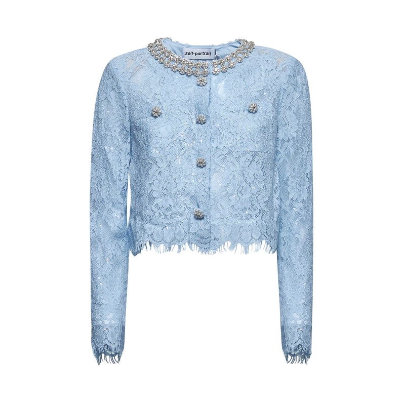 Front covered snap button placket; decorative jewel buttons at frontCrystal-embellished crewneckLong sleeves, shoulder padsPatch pockets at chest with decorative jewel buttonsScalloped hemsLinedMicro sequin-embellished floral lace designCropped length; box