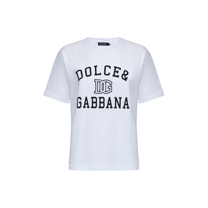 Dolce & Gabbana’s white cotton t-shirt featuring a crew neck, printed lettering logo + embroidered DG logo on the front.