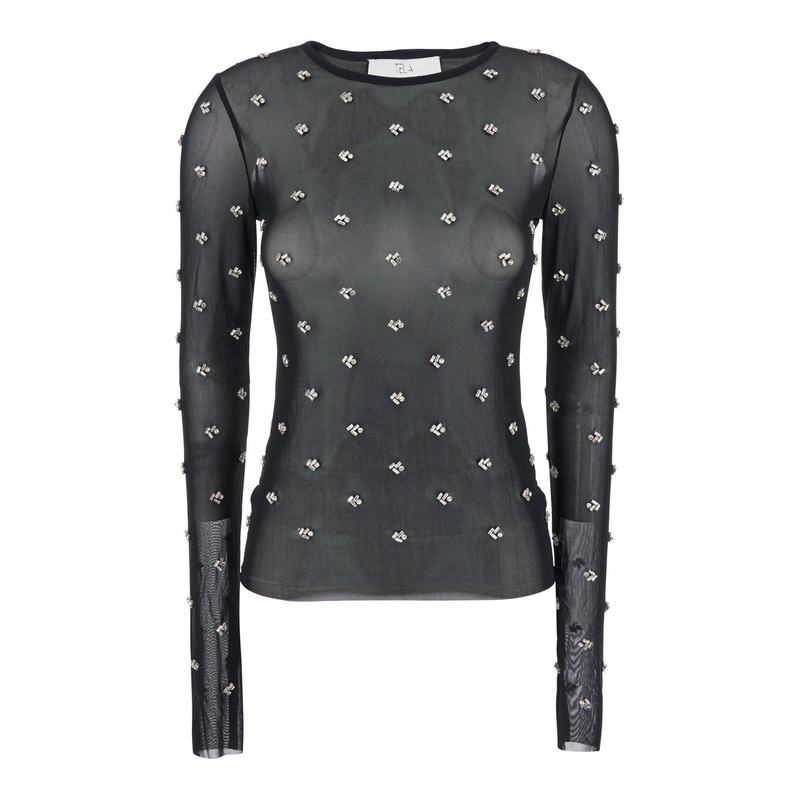 description" content=" top black crewneck long sleeves straight hem embellishments on front and sleeves semi sheer design tech fabric regular fit - Shop online on Gaudenzi Boutiq ...
