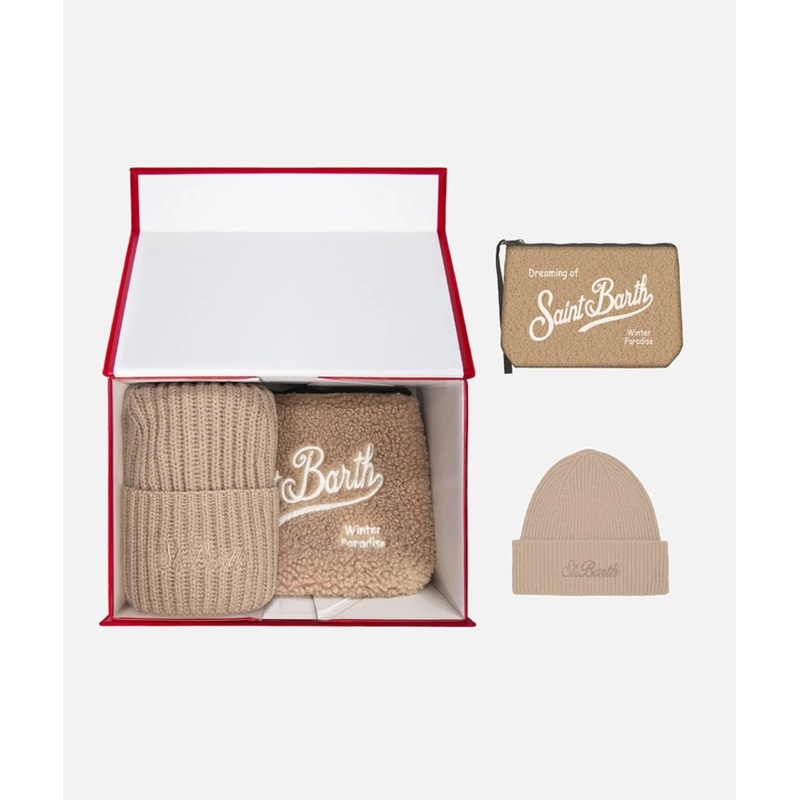 Saint Barth “Teddy 11 emb” box, brown color, consisting of: “Moss Wool” ribbed hat and matching “teddy 11 emb” aline clutch bag.