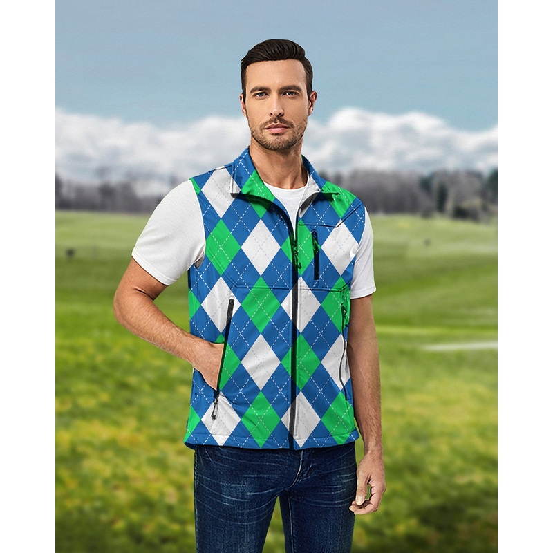 Men’s Argyle green blue Lightweight Softshell Vest Sleeveless Jacket for Golf Windproof Waterproof