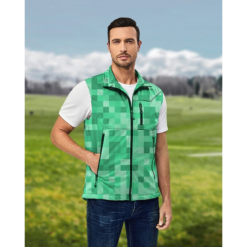 Men’s Green Pixel Big Lightweight Softshell Vest Sleeveless Jacket for Golf Windproof Waterproof
