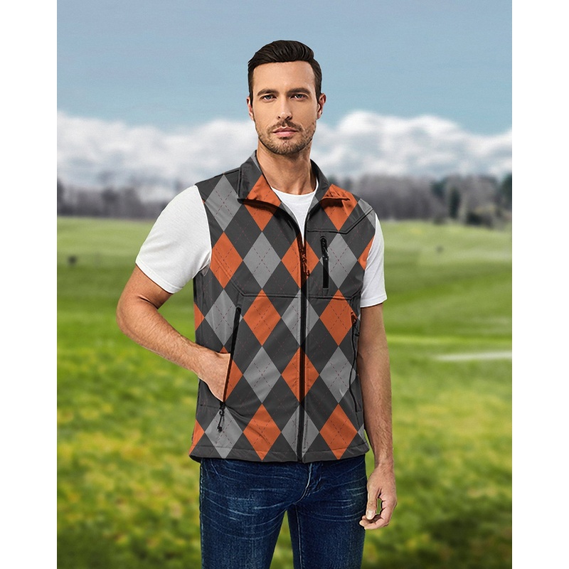 Men’s Halloween Black Red Argyle Lightweight Softshell Vest Sleeveless Jacket for Golf Windproof Waterproof
