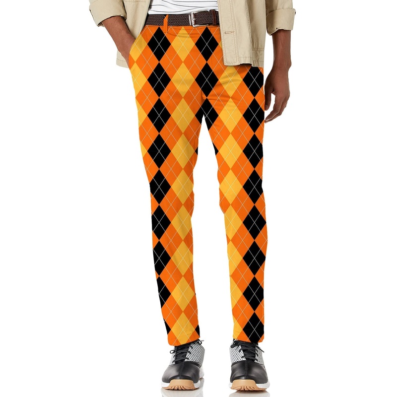 Men’s Halloween Black Yellow Orange Argyle Stretch Golf Pants