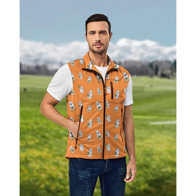 Men’s Halloween Ghost Pumpkin Basket Custom The Background Color Lightweight Softshell Vest Sleeveless Jacket for Golf Windproof Waterproof