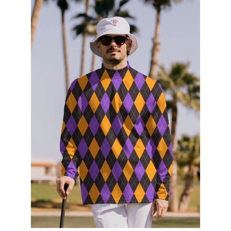 Men’s Orange purple and black argyle Pullover High neck Long/Short sleeve T-Shirt