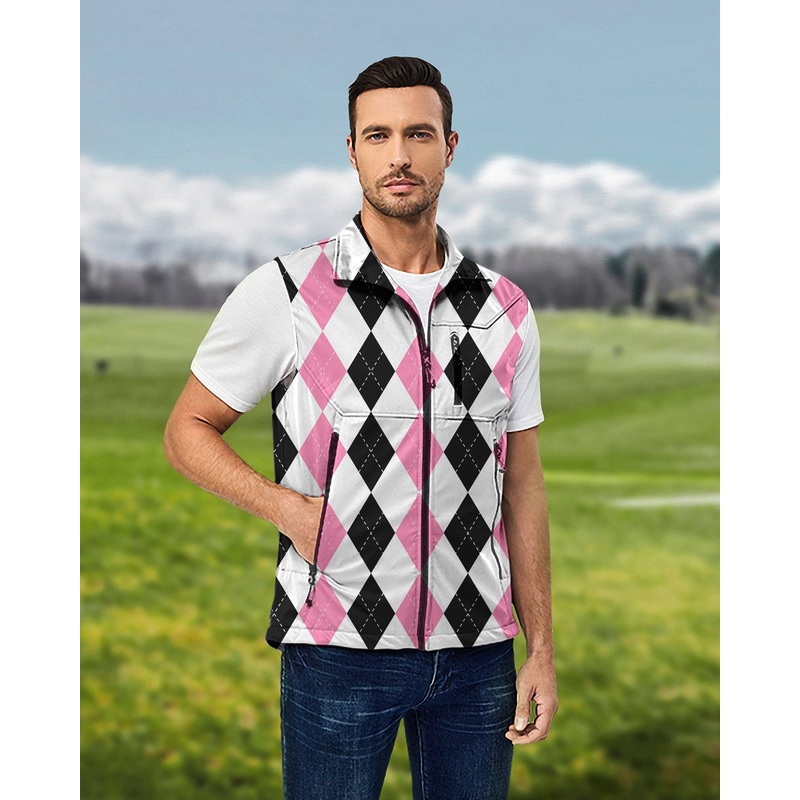 Men’s pink black argyle Lightweight Softshell Vest Sleeveless Jacket for Golf Windproof Waterproof