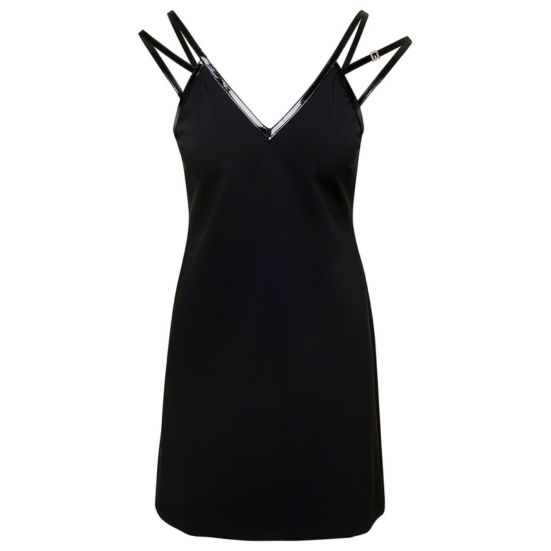 description" content=" mini dress v neckline double strap square g embellishment black patent leather trim invisible zip fastening at the back straight hem black stretch viscose ...
