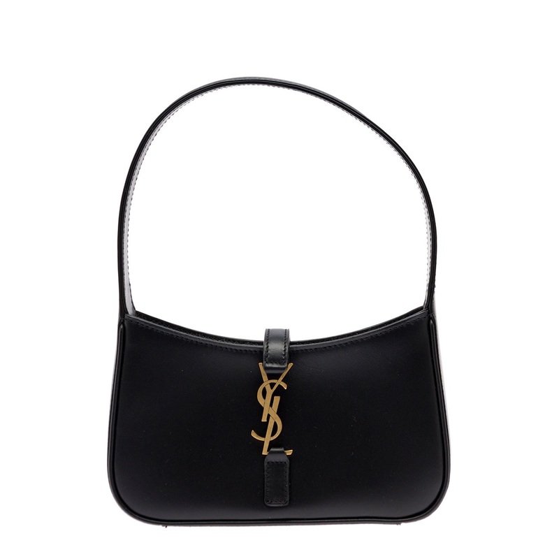 description" content="Shoulder bag closure with front metal logo buckle fixed single top handle antique gold hardware tonal stitching one main internal compartment black smooth l ...