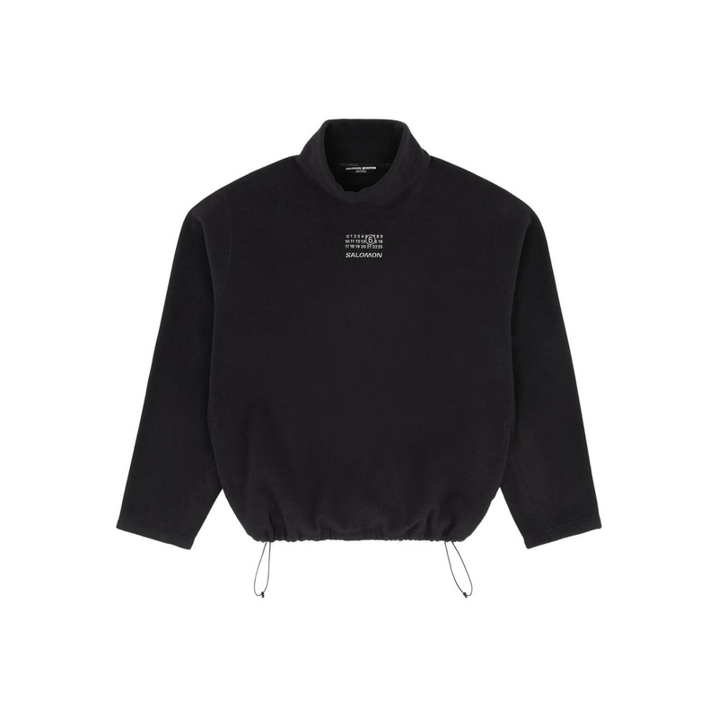 This stylish MM6 Maison Margiela x Salomon sweater showcases a contemporary design with a black turtleneck silhouette. Featuring a drawstring hem and long sleeves, it is perfect for keeping warm while maintaining a chic look. The sweater is adorned with a