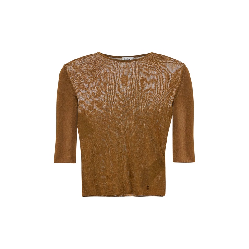 CrewneckThree-quarter sleevesTone-on-tone Cassandre embroidery at front hemSlightly cropped cutSemi-sheer designMordore color100% ViscoseMade in Italy