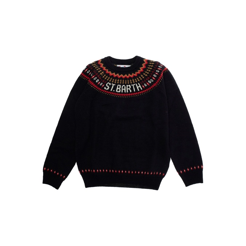 Multicolor Crewneck Sweater with Geometric Embroidery and Logo Lettering on the Front in Wool Boy