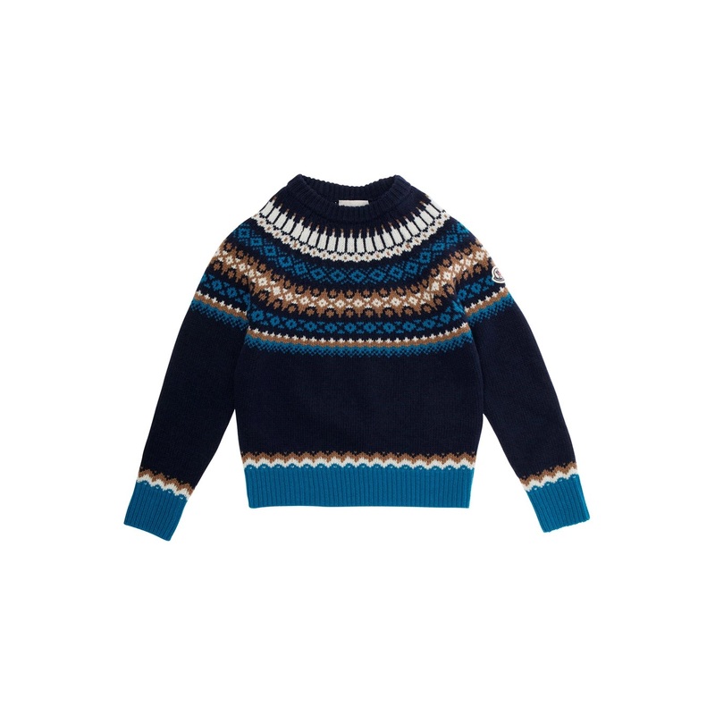 Multicolor Crewneck Sweater with Geometric Embroidery and Ribbed Trims in Wool Boy