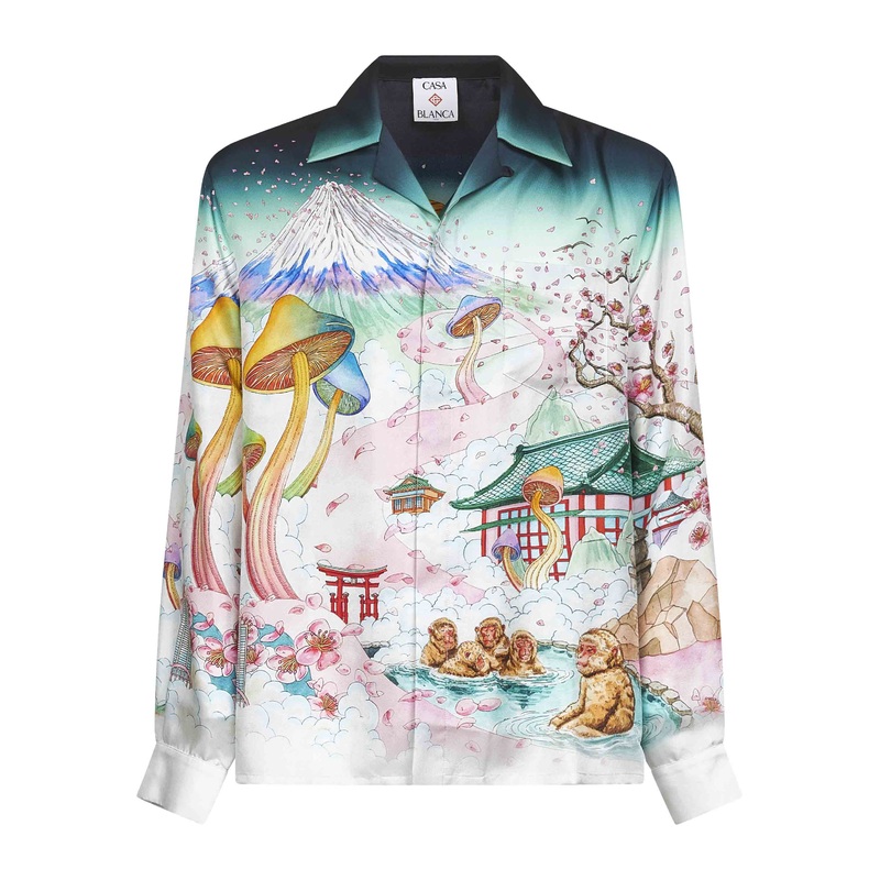 Front covered button placket; interlocking CC logo corozo buttons Cuban collar Long sleeves, gold rim enamal buttons at cuffs Patch pocket at chest Straight hem All-over printed multicolor Fame Laurel artwork Relaxed fit Color: multicolor 100% Silk Made in
