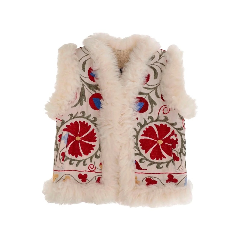 Multicolor Sleeveless Jacket with Fur Trims and All-Over Floral Motif in Cotton Woman
