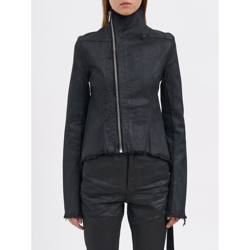 This slim-fit jacket features a sleek front zip closure and a distinctive high neck that creates a modern, architectural silhouette. The waxed denim finish adds an edgy, luxurious texture while providing subtle weather resistance.