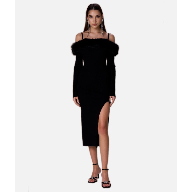Knit dress with long sleeves, thin shoulder straps, and a boat neckline accented with faux fur details. A fitted, pencil dress with a side slit that accentuates a woman's femininity.