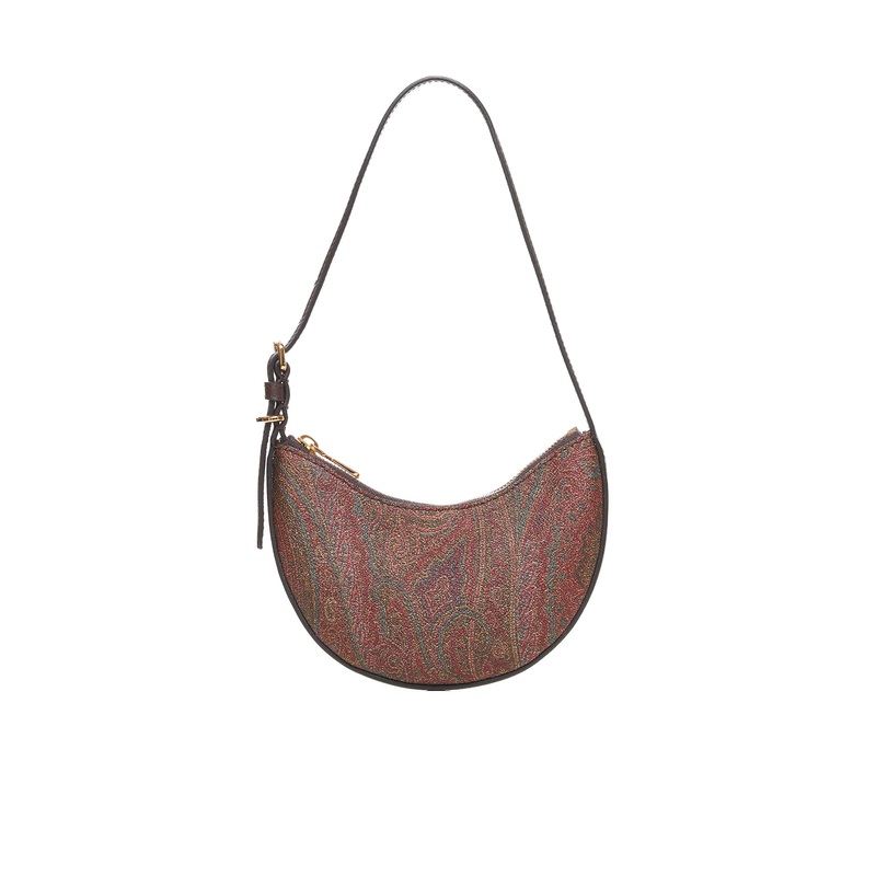 Etro’s mini hobo bag in multicolor Paisley cotton blend fabric and brown leather featuring an half moon silhouette, adjustable shoulder strap, zip fastening, internal card slot and gold-tone metal hardware.