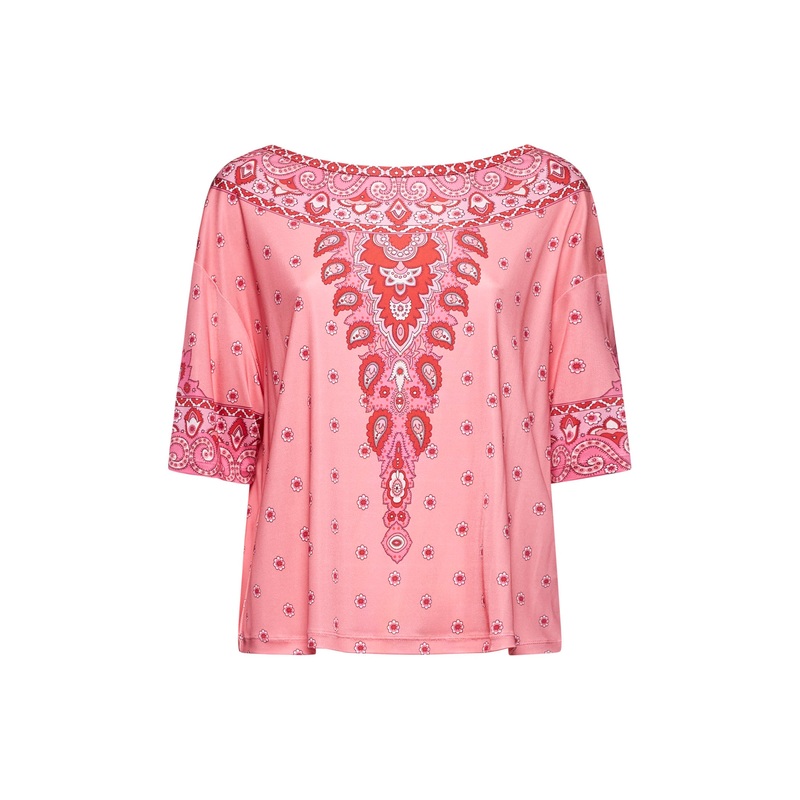 Boat necklineShort sleeves, dropped shouldersPlaced floral Paisley print with ornamental bordersRegular fitPink color96% Viscose, 4% ElastaneMade in Italy