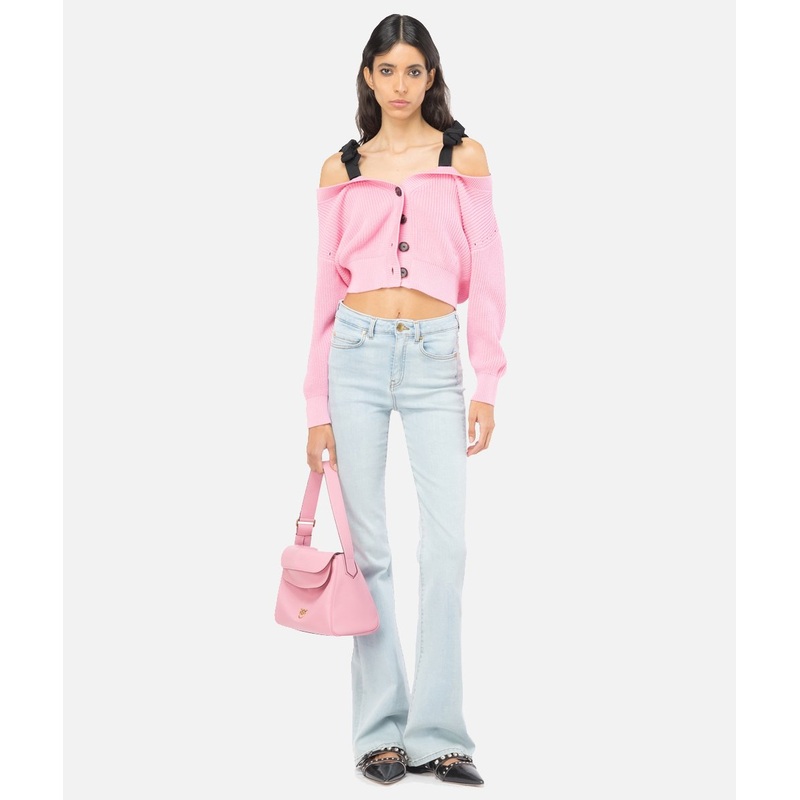 Five-pocket flare-fit jeans in baby blue stretch denim, light bleached wash. Regular waist with belt loops, matching belt in the same fabric with mini Love Birds Diamond Cut buckle and fitted leg, flared at the bottom. Zip and metal tack button closure.