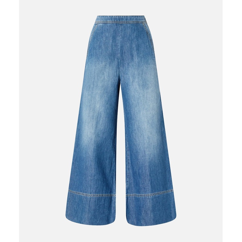 Palazzo-silhouette jeans made from lightweight cotton and linen blend denim with a medium-dark wash. This particular model is characterised by a very wide leg, with a slight flare at the bottom that amplifies the palazzo line, and is perfect for the summer