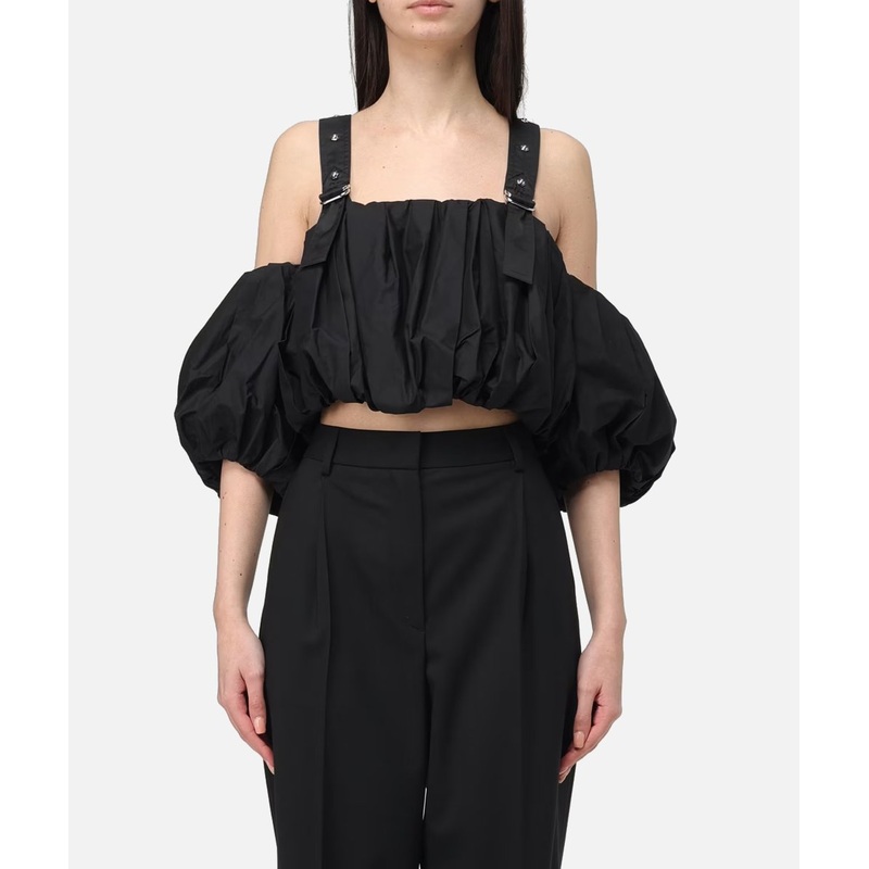 Cotton crop top with straight scoop neckline, adjustable contrasting shoulder straps and puff sleeves.