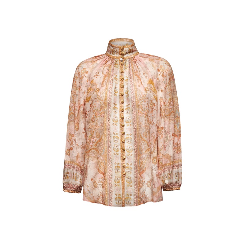 Front button placketHigh collar; gathering at necklineWide long sleeves, elasticated cuffsAll-over placed printRelaxed fitColor: multicolor100% RamieMade in Extra EU
