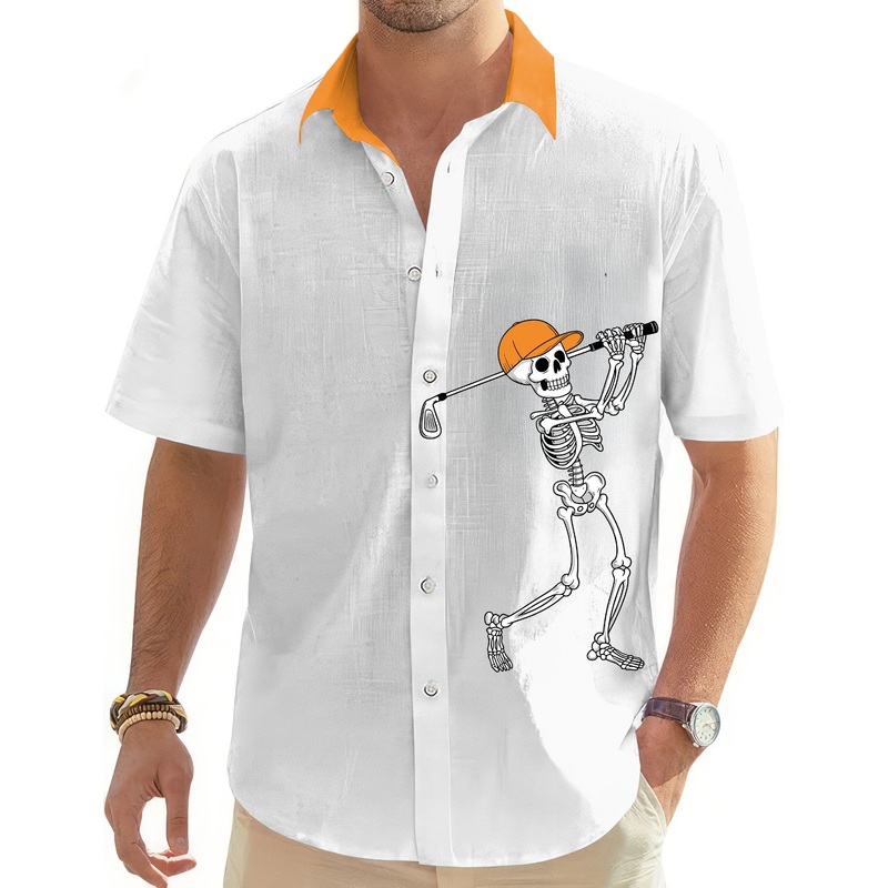 Pumpkin White Halloween Skeleton Golf Men’s Golf Hawaiian Shirts Button Down Shirt