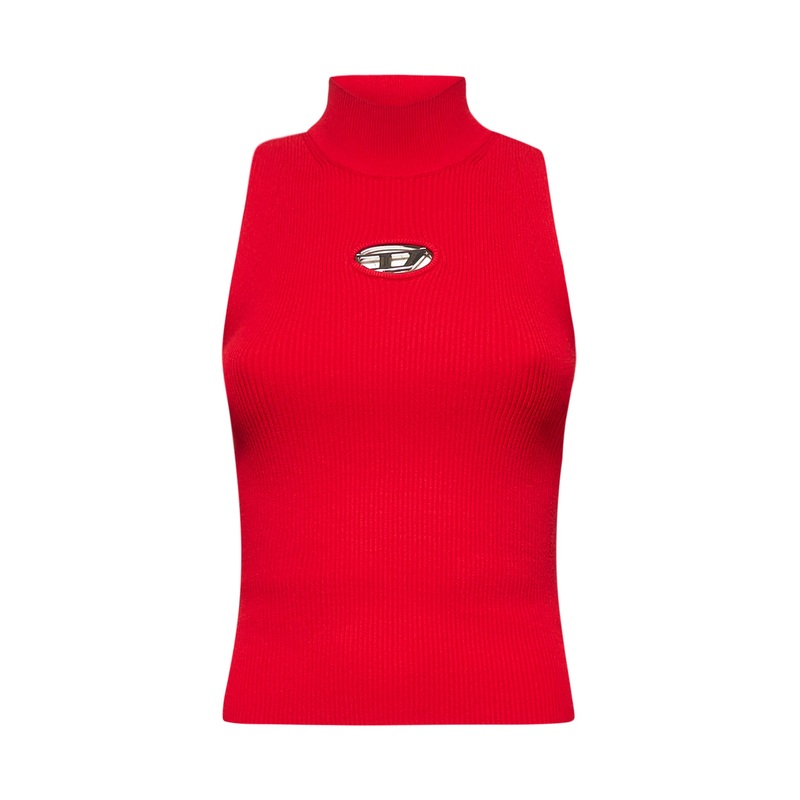 Ribbed high collarSleevelessMetal Oval D logo intarsia plate at chest with cut-out detailingRibbed jersey designSlightly cropped lengthSlim fitRed color83% Viscose, 17% PolyesterMade in Extra EU
