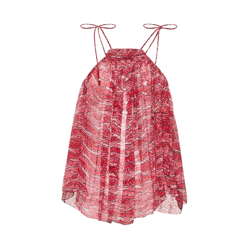 Halter neckline with self-tie beaded strings at shouldersWide armholes; sleevelessGathered detailing at front; pleated detail at front and backFlared bottomRounded hemAll-over printFlowing cutRed color100% ViscoseMade in Extra EU