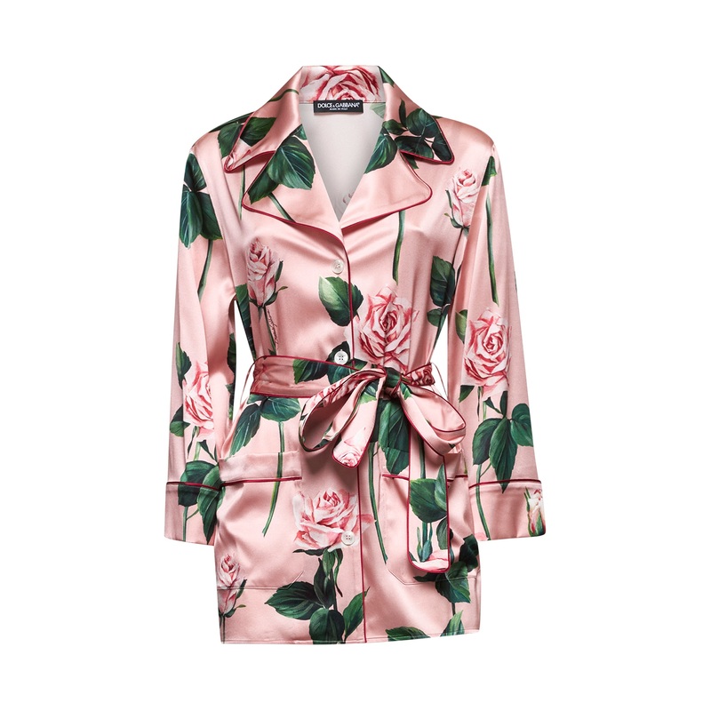 Front button placketLapel collarLong sleevesAdjustable and detachable matching belt at waist; belt loopsFront patch pocketsContrasting satin piping detailingAll-over multicolor Rose printPink color93% Silk, 7% ElastaneMade in Italy