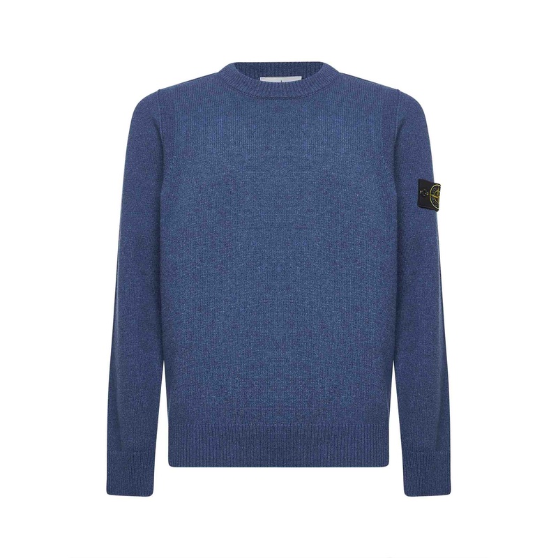 Ribbed crewneck Long sleeves, plain stitch knit bands at shoulders and along the front armholes; topstitching at armholes Stone Island badge at left sleeve Ribbed cuffs and bottom band Plain stitch knit design; 7 gauge Regular fit Steel blue color 80% Wool